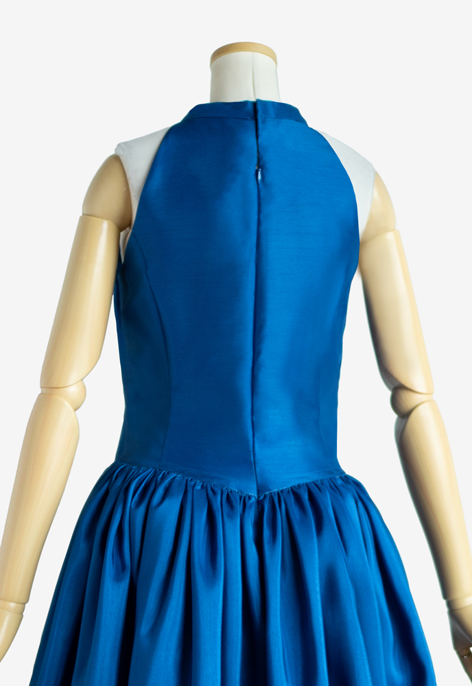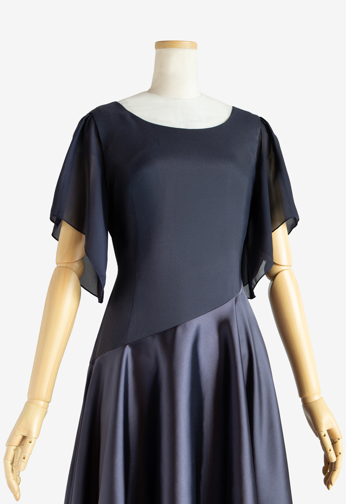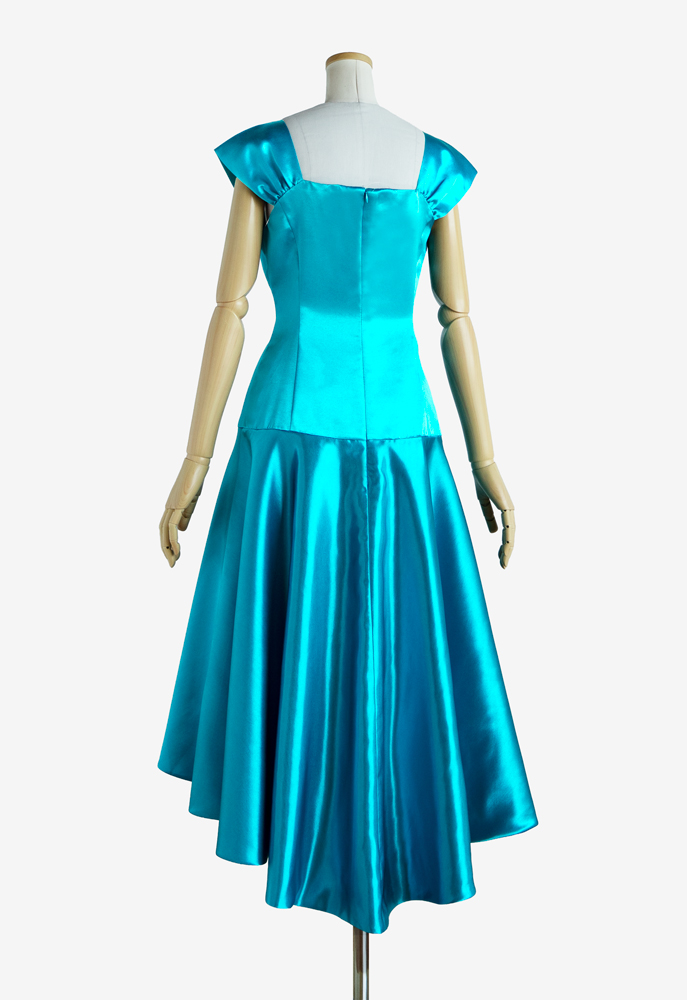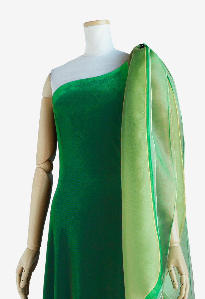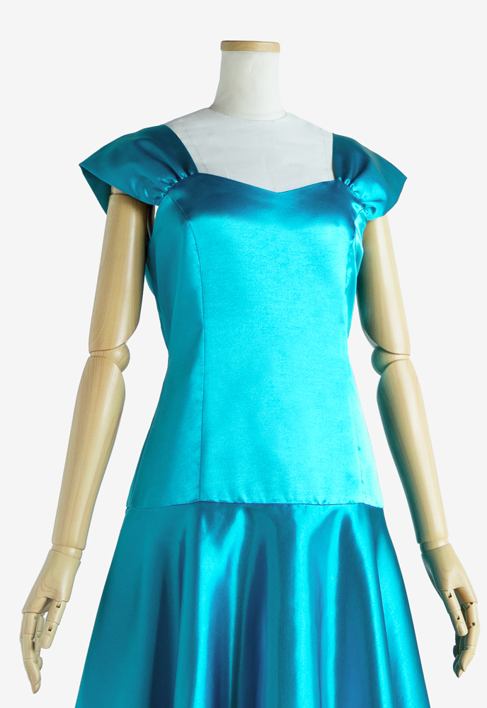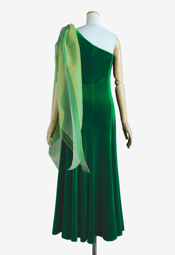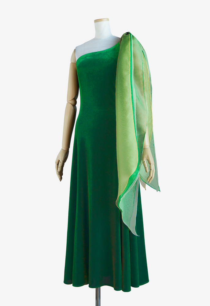 オーダーメイドのフラドレスをご注文いただきました。上身頃にはストレッチサテン、スカートにはサテンのシルバーグリーンを使用し、ホワイトのストレッチレースとイエローグリーンのオーガンジーをそれぞれにレイヤード。ケープ部分はVネックになっており、艶やかな印象を与えてくれます。また、サーキュラースカートは通常よりも布分量が多く、優雅な広がりが美しい上品な衣装に仕上がりました。