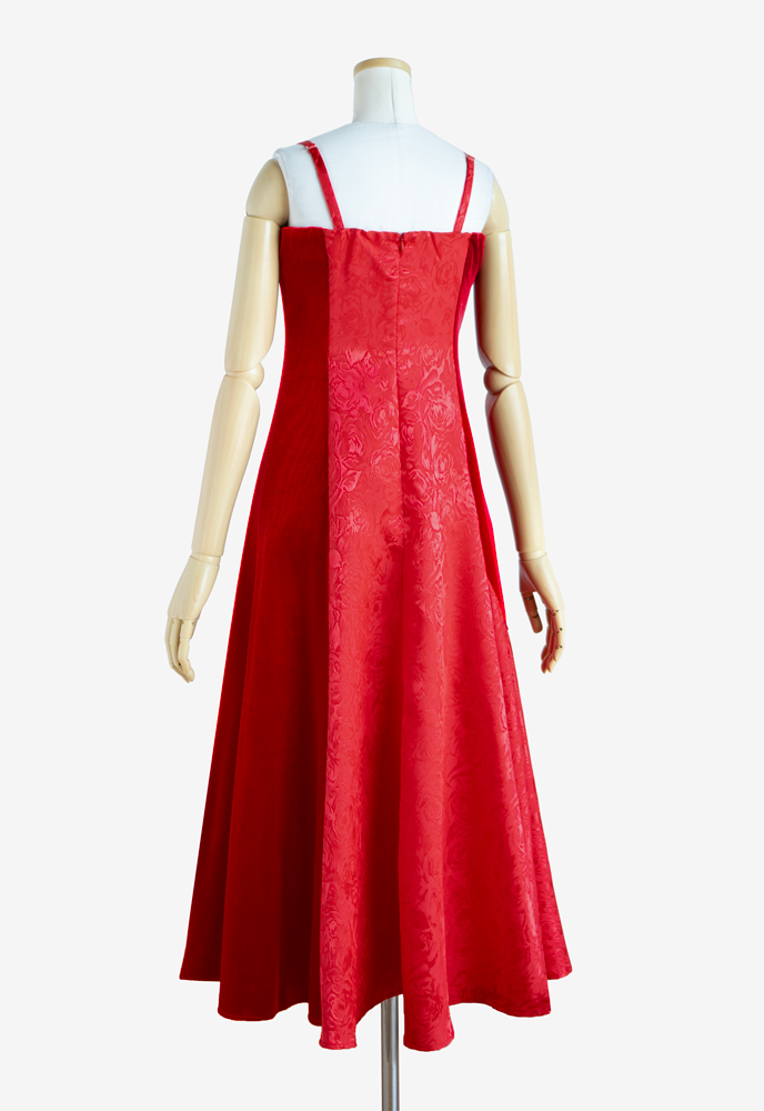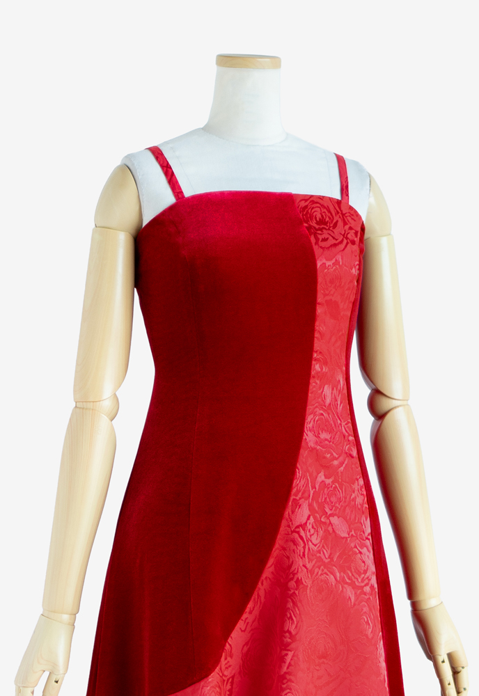 フラドレス63に七分袖をカスタマイズしてご注文いただきました。生地はストレッチベロアのフーシャと当店オリジナルプリント「夢ごこち001 レッドピンク」を施したシャンタンを使用。ストレッチベロアの艶やかな身頃に、思わず目を引く華やかで可愛らしいプリント柄が施されたシャンタンの切替が、お客様のメレをより一層煌びやかに引き立たせてくれます。