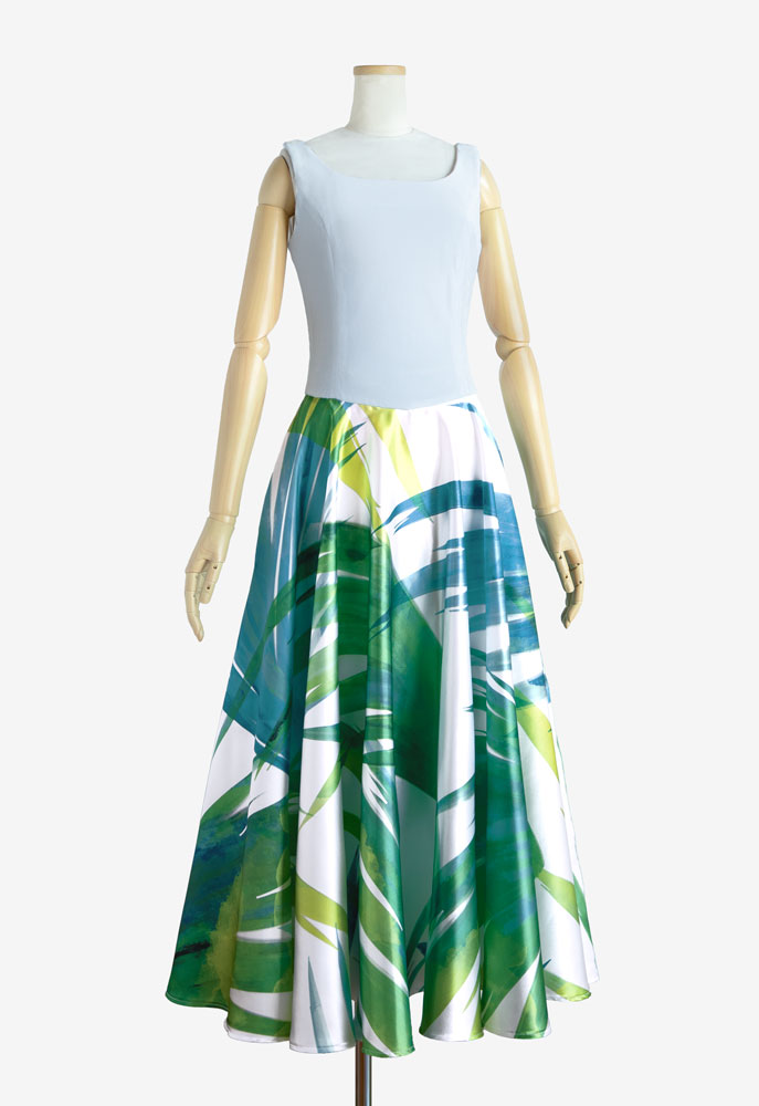 ベロアの上身頃と広がりが美しいサーキュラーの組み合わせが魅力の、フラドレス121をご注文いただきました。生地には別注の白いベロアと、当店オリジナルプリント「揺らぎ001 大 グリーン」を施したサテンを使用。踊られる楽曲は「Kipahulu」。自然への感謝を表すこの曲に合う、空を漂う雲のようなベロアとスカートの椰子の葉が、自然の美しさ感じさせる、フラダンス衣装に仕上がりました。