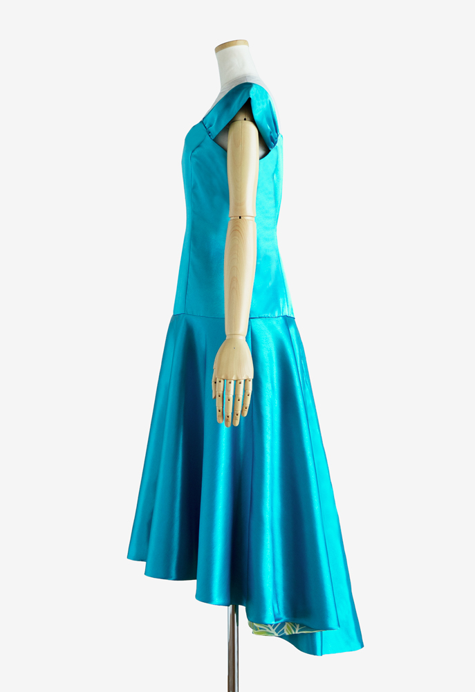 斜めにカットされたスカート裏からハワイアンファブリックが覗く、華やかなフラドレス64をご注文いただきました。ドレスの表地にはシャンタンのターコイズを裏使い、スカート裏にはハワイアンファブリックの「アクア×グリーンバナナリーフ柄」を使用。裏使いのシャンタンの光沢がステージによく映え、舞に合わせてスカートの裾がダイナミックに広がる、豪華なフラダンス衣装に仕上がりました。