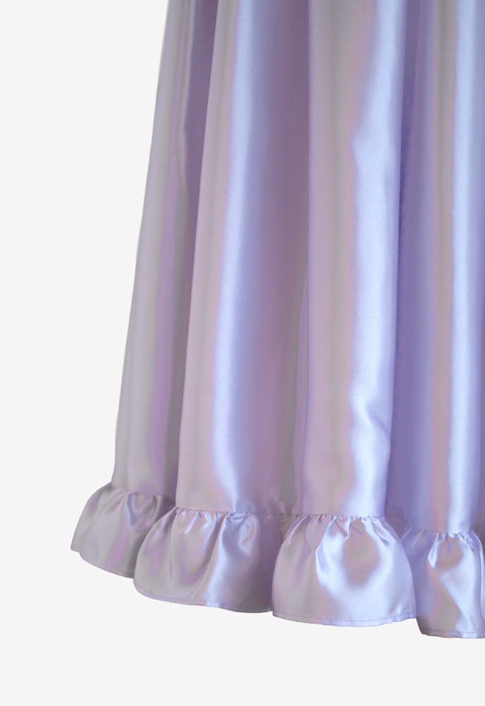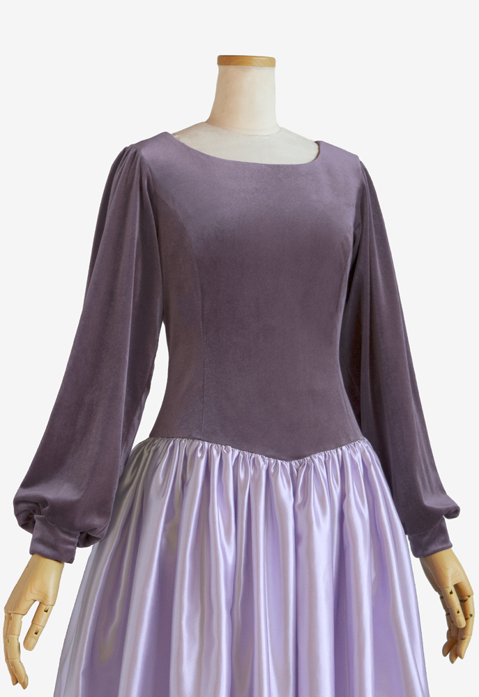 スタンダードなノースリーブとギャザースカートが特徴のフラドレス46に長袖と裾にフリルのカスタマイズでご注文いただきました。生地は上身頃にスモーキーパープルのストレッチベロア、スカートと裾フリルには白藤色のサテンを使用。上品で機能的な上身頃に、舞に合わせて可憐に広がるスカートの組み合わせは、クラシカルかつ華やかなフラダンス衣装です。