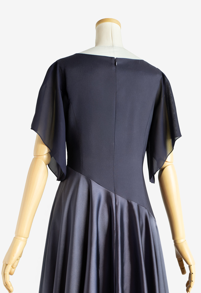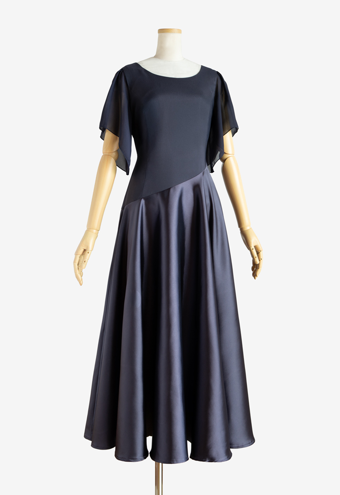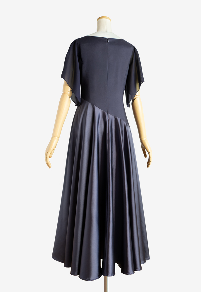 斜めの切り替えが潔いフラドレス53に、切り替え位置の変更、シフォン袖を追加するカスタマイズでのご注文をいただきました。ストレッチサテンのグレープグレーを、上身頃は裏使い、スカートは表使いで使用。シックな雰囲気が大人の女性の魅力を引き出しつつ、舞に合わせてひらひらと揺れる可憐なシフォンのお袖と、広がりの美しいフレアースカートが華やかなフラダンス衣装に仕上がりました。