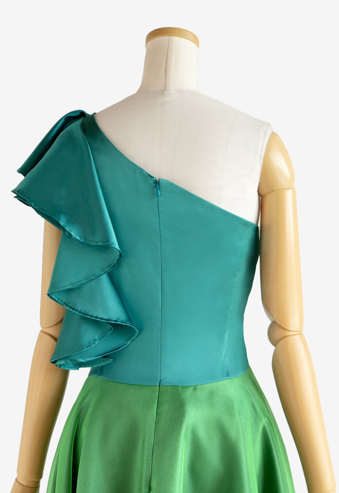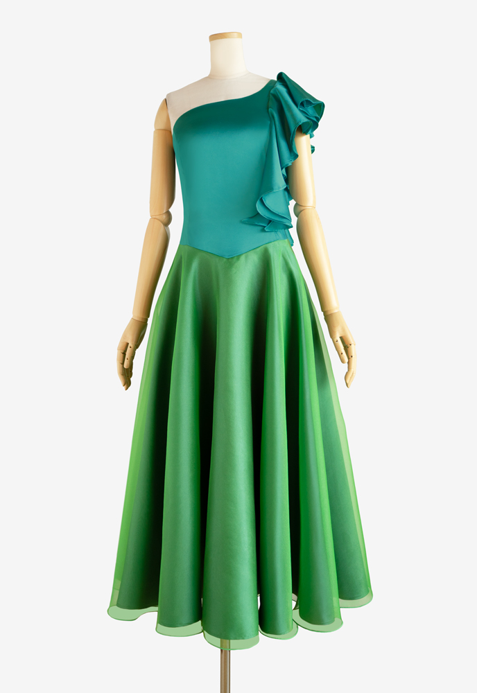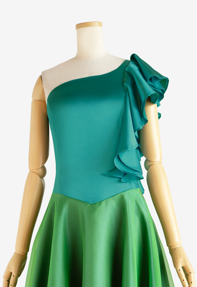フラドレス65をベースに、上身頃の設えを、肩にフリルが流れるワンショルダーに変更し、スカートにオーガンジーを重ねるなどのカスタマイズを施してお仕立てしました。踊られる楽曲は「Maui kamahao」。上身頃はストレッチサテンのビリジアン、スカートにはストレッチサテンのミントとオーガンジーのイエローグリーンを使用し、マウイ島に想いをはせ体現するかのようなお衣装に仕上がりました。
