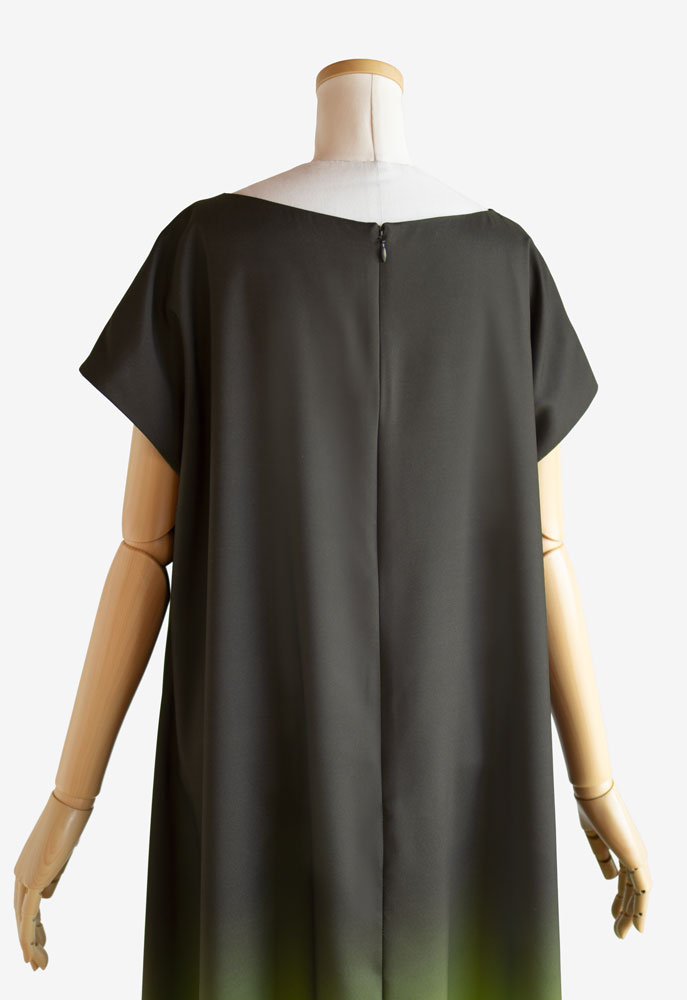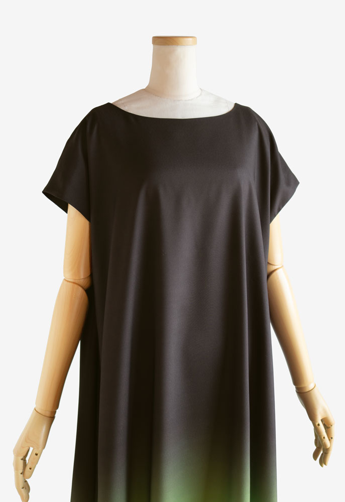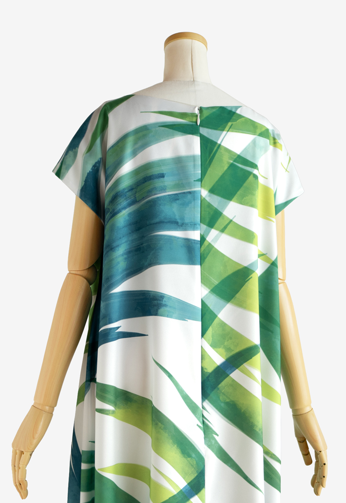 裏使いのストレッチサテンに当店オリジナルプリントの「揺らぎ001大 グリーン」を施してお仕立てした、イージーフラドレス01をご注文頂きました。穏やかでありつつも凛としている。そんな美しさをゆったりとしたシルエットで纏い、踊られる楽曲は「プアオレナ」と「秋桜」。たおやかに舞うお姿が目に浮かぶかのような、フラダンス衣装に仕上がりました。