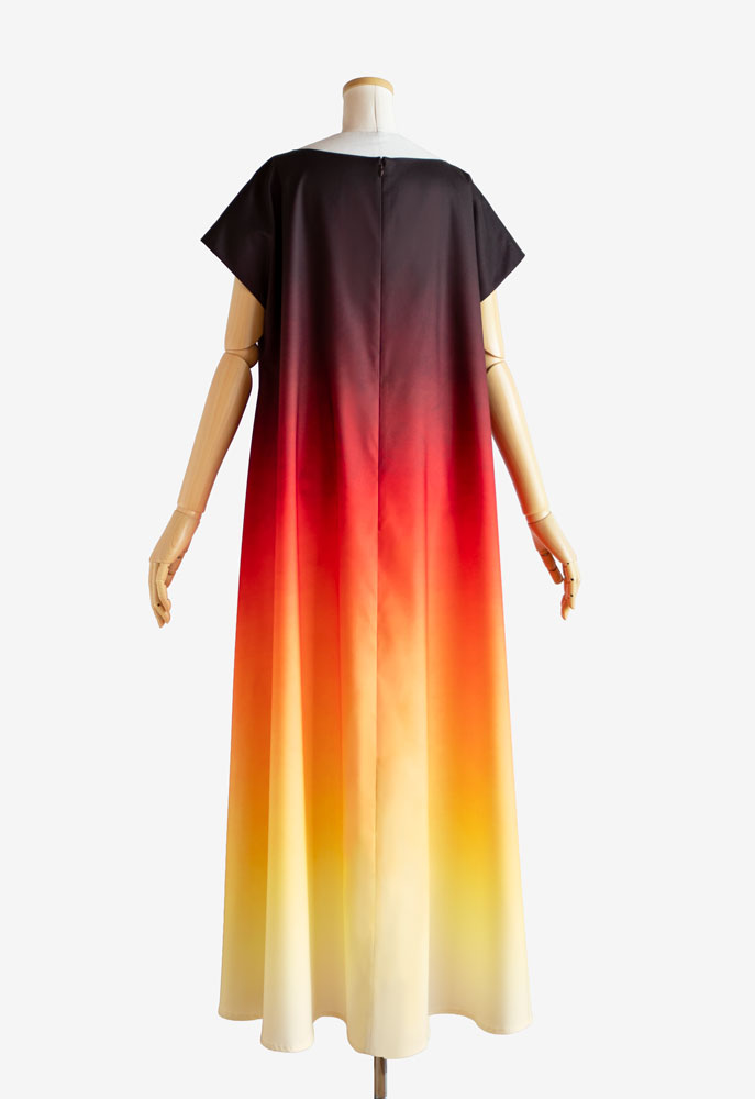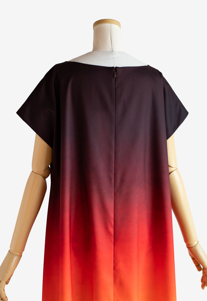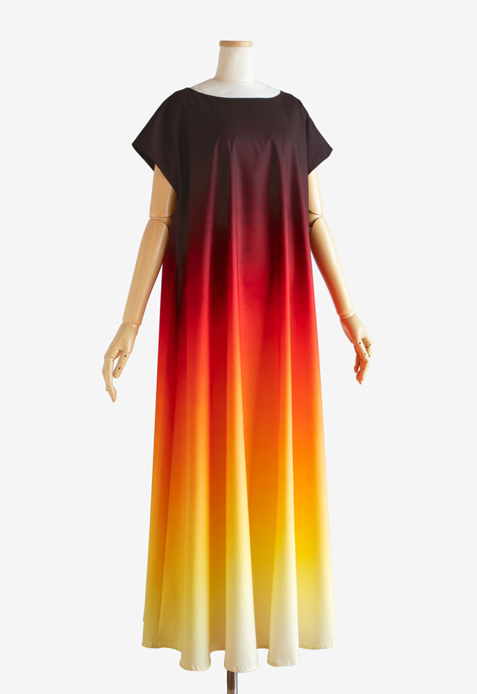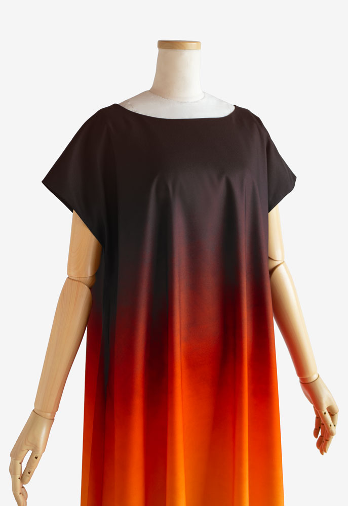 裏使いのストレッチサテンに当店オリジナルプリントの「うつろいパウダー002 ルアペレ」 を施してお仕立てした、イージーフラドレス01をご注文頂きました。深みのあるレッドから鮮やかなオレンジ、そしてやわらかな光を含むイエローへ移るグラデーションのプリント。沈みゆく太陽が海と空を染める、まるでサンセットのような美しさとノスタルジーを纏うフラダンス衣装に仕上がりました。