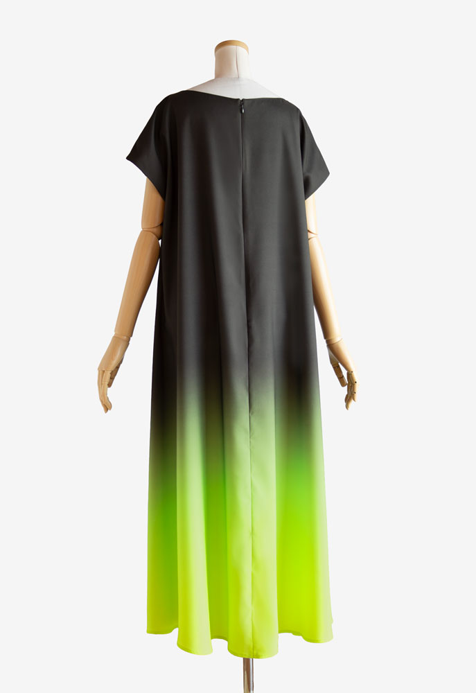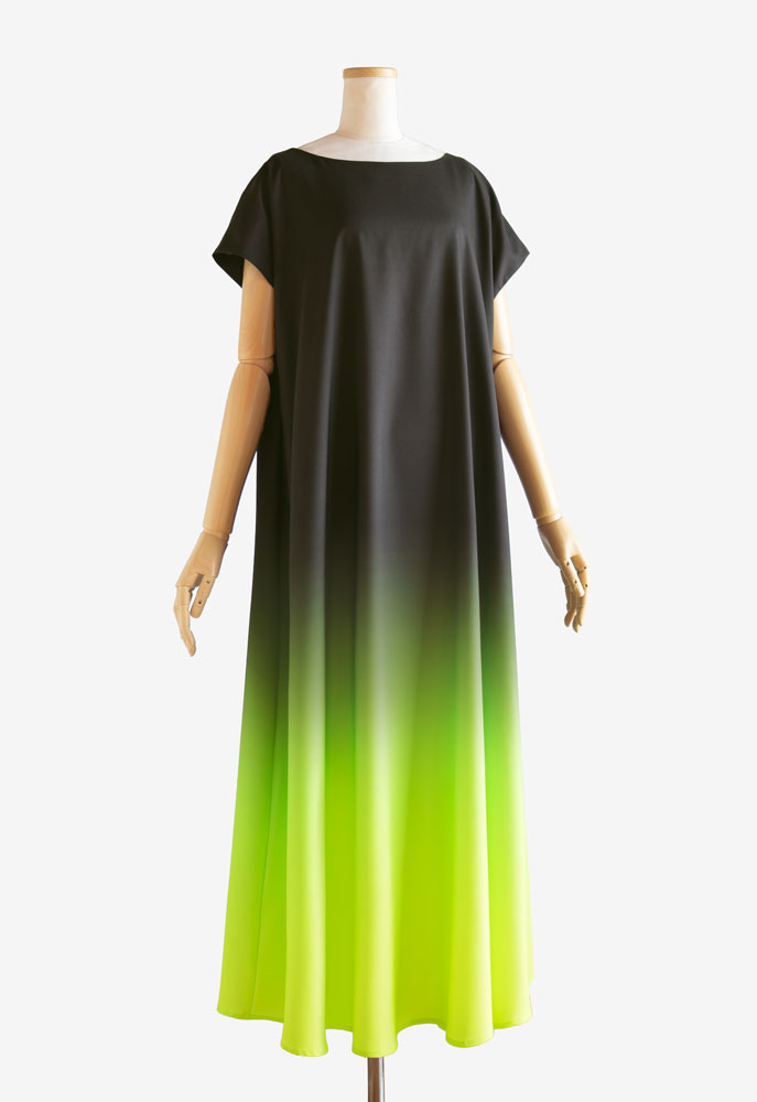 裏使いのストレッチサテンに当店オリジナルプリントの「うつろい009 ミステリアスアース」 を施してお仕立てした、イージーフラドレス01 をご注文頂きました。深みのあるダークブラウンから、裾に向かって広がるのはエネルギーあふれるライムグリーン。大地から豊かな生命が芽吹くような、自然を感じるお色です。ステージでも目を引く、存在感のあるフラダンス衣装に仕上がりました。