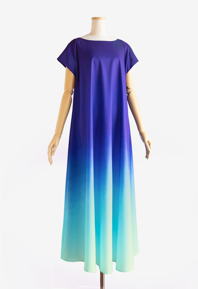 シフォン袖が取り外せるというカスタマイズが施されたフラドレス70をご注文いただきました。当店オリジナルの「うつろいパウダー001 オーシャンタパ柄」がプリントされたポリエステルブロードとプリントカラーに合わせたシフォンを使用。そんなすっきり流れるグラデーションプリントや可憐に揺れるシフォン袖の深い碧はマカナ山からみえる海を彷彿。どこまでも気持ちのよいフラダンス衣装です。