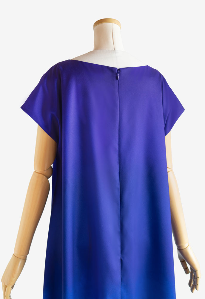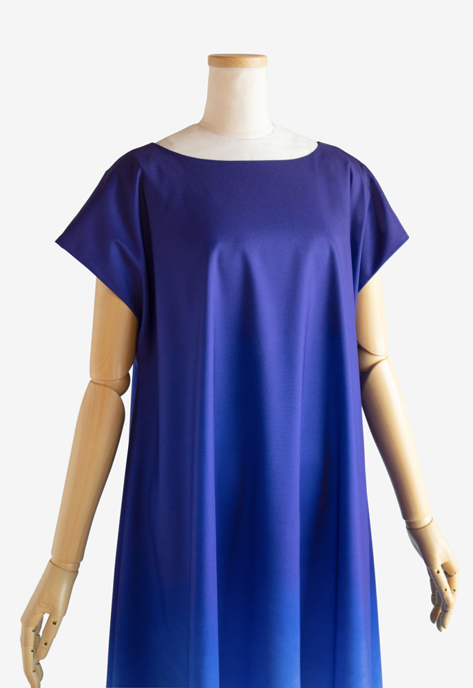 裏使いのストレッチサテンに当店オリジナルプリントの「うつろいパウダー002 オーシャンブルー」を施してお仕立てした、イージーフラドレス01をご注文頂きました。イージーフラドレスのゆったりとしたフォルムに深い海を思わせるお色のプリント。舞う度にまるで海の中を漂うかのような、幻想的な表情を生み出します。静けさと深みのある美しさをあわせ持つ、印象的なお衣装です。
