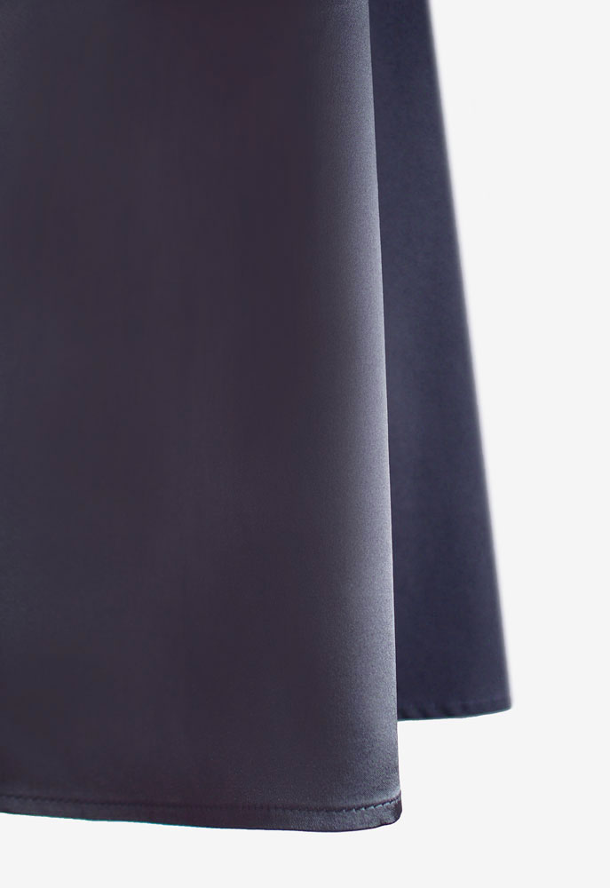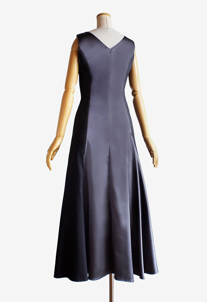 レース使いのフラドレス65をカスタマイズした、オーダーメイドフラドレスをご注文頂きました。使用した生地は、ストレッチサテンのネイビーと、水色の色味にこだわった別注色のレース。衿ぐりはアメリカンスリーブデザインに変更し、背中には大きめの開きを施しました。繊細なレースと艶のあるデザインが相まった、この上ない女性美を感じるフラドレスとなっております。