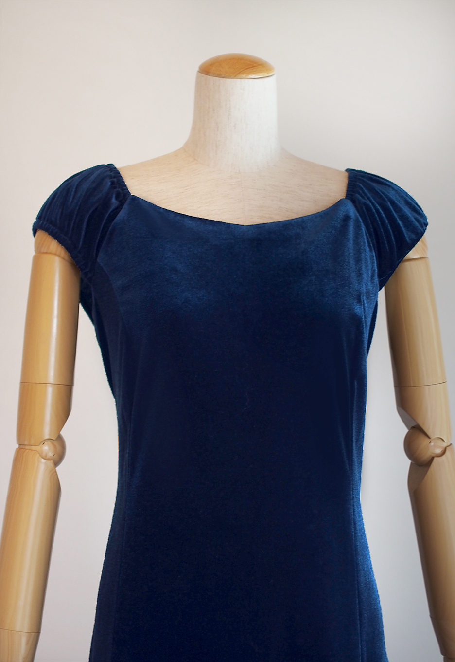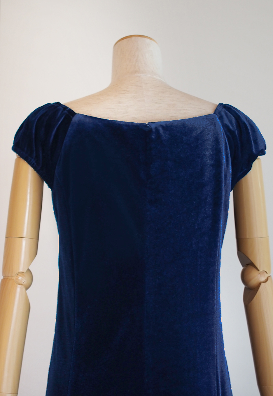 フラドレス28に取り外しケープをお付けしてお仕立て致しました。 使用した生地はベロアのウルトラマリン。 ケープをお付けすればシンプルなベアトップドレスが麗しく華やかなドレスに。大きく開いた首まわりのゆるやかなカーブが、「艶やかさ」と「女性らしさ」を際立たせています。