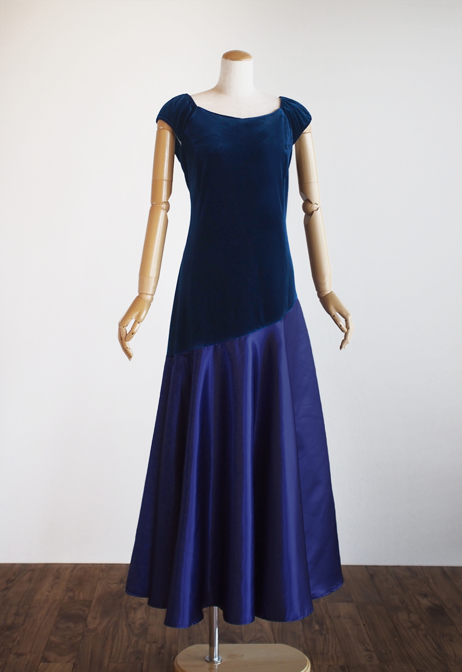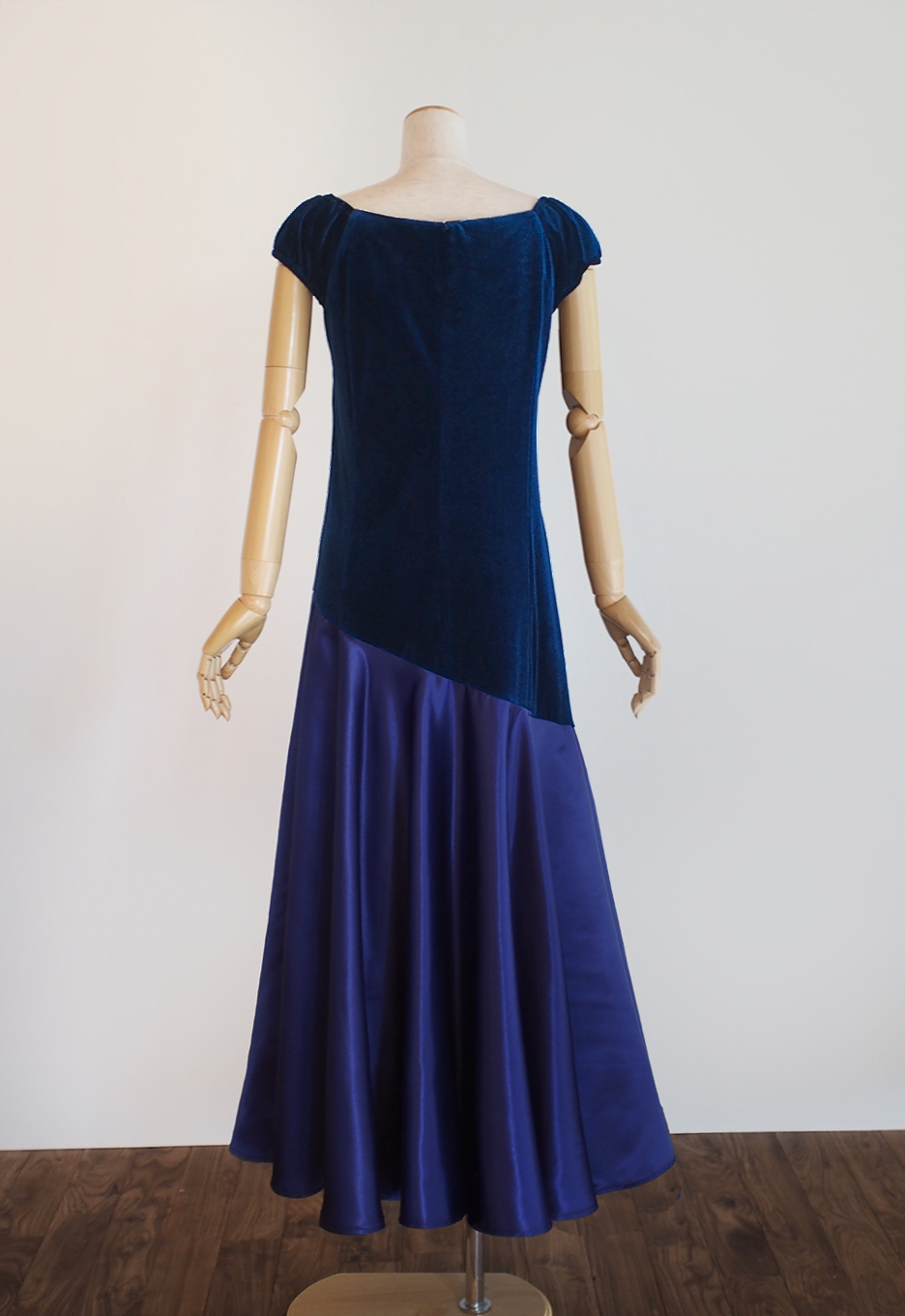 フラドレスC10を、上身頃はベロアのミッドナイトブルー、スカートはシャンタンのミッドナイトブルーを裏使いにしてお作りいたしました。共にミッドナイトブルーという色を使用されることで、上品な質感のベロアと煌びやかなシャンタンの「特徴のコントラスト」をスマートに表現。夜空に溶けるような、神秘的なフラドレスに仕上がりました。