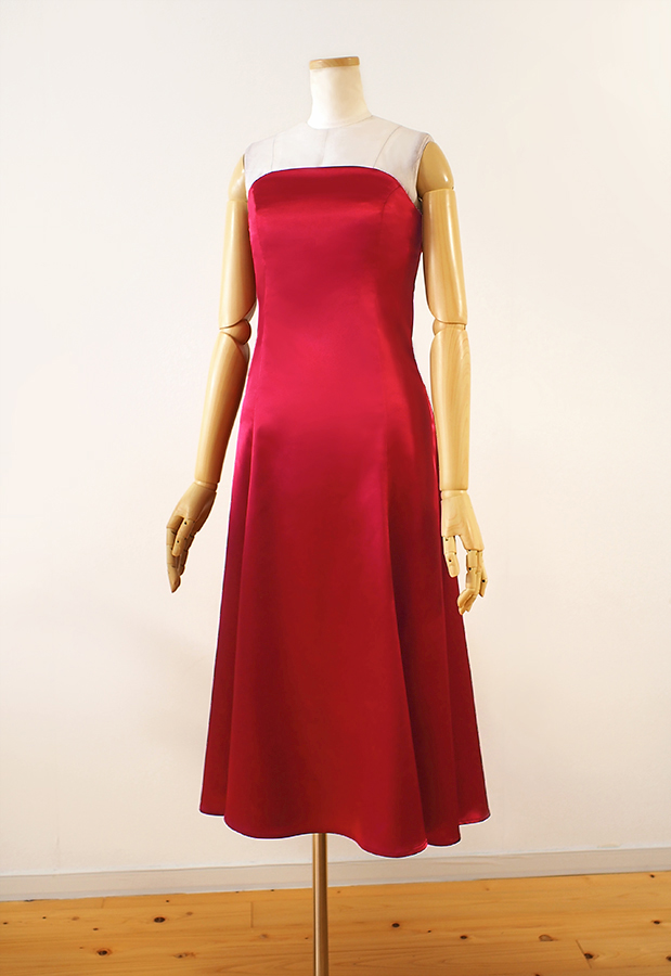 当店のフラドレス28を、ストレッチサテンのディープレッドでお作りしました。シンプルで艶やかなフラドレス。洗練されたラインが、踊り手を美しく包み込み、美麗な雰囲気を漂わせます。深い赤色のサテンは、大人の女性を魅力的に演出し、ステージを魅了するでしょう。