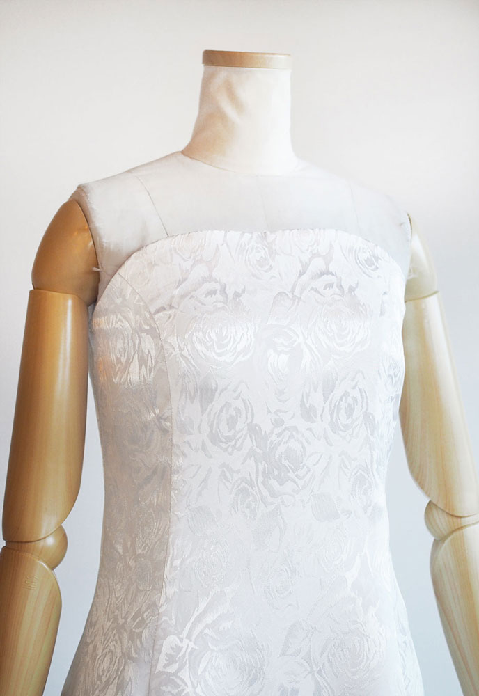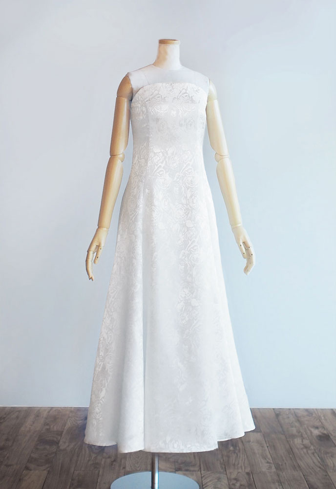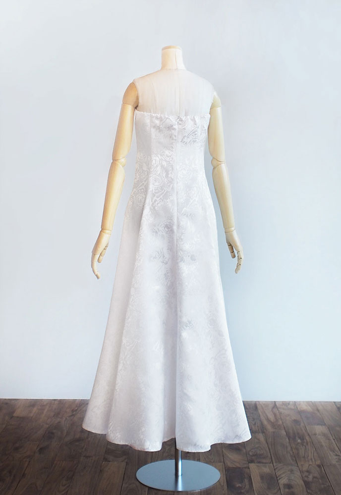 フラドレスC07をベアトップにカスタマイズして、ジャカードのイノセントホワイトでお作りいたしました。C07のシンプルかつエレガントな雰囲気に磨きがかかり、さらに艶やかさも加わったフラドレス。清純なロケラニが舞う様は、舞台の上を華々しく飾り、その煌めきに人々は魅了されることでしょう。
