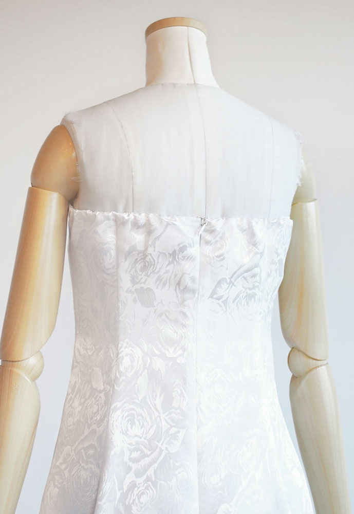 フラドレス22をシャンタンのネイビーとアクア プロテア柄の生地でお作りし、さらにスカートにはネイビーのオーガンジーを重ねました。ネイビーとプロテア柄のコントラストがオーガンジーによって調和され、まるで月明かりに照らされる水面のよう。水音だけが響く静寂の中でまどろんでいるような、心安らぐ衣装に仕上がりました。