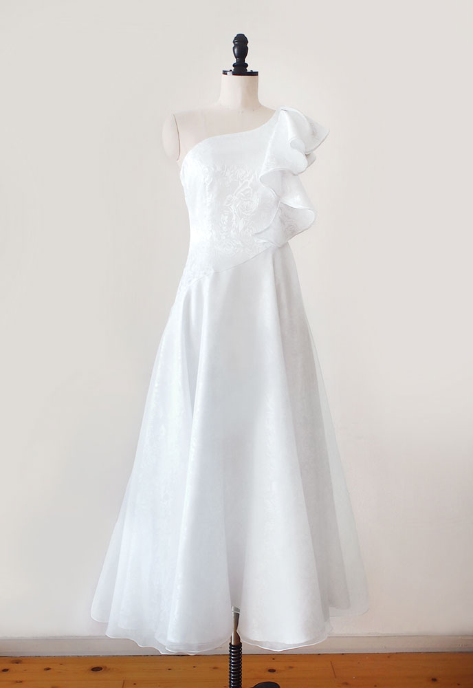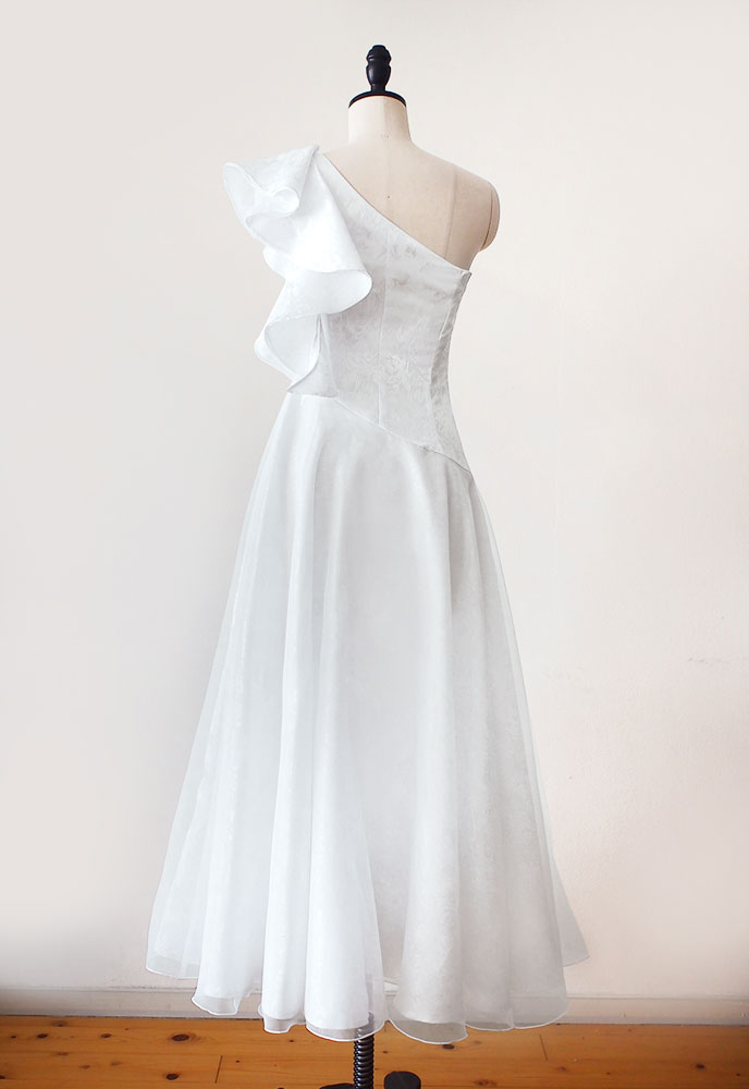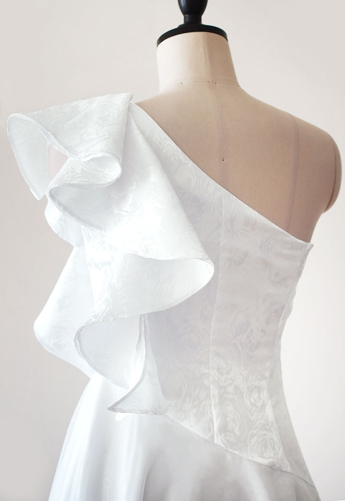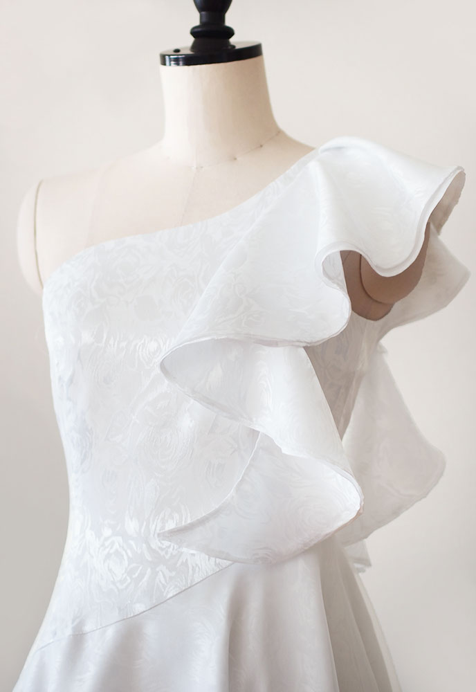 フラドレス40をジャカードのイノセントホワイトを使用してお作りしました。スカートには切替からホワイトのオーガンジーを重ねるカスタマイズを施しています。流動的なフリルのデザインが、ロケラニの輝きを一層際立たせています。さらに透明感溢れるオーガンジーを重ねることで、清純なフラドレスに仕上がりました。